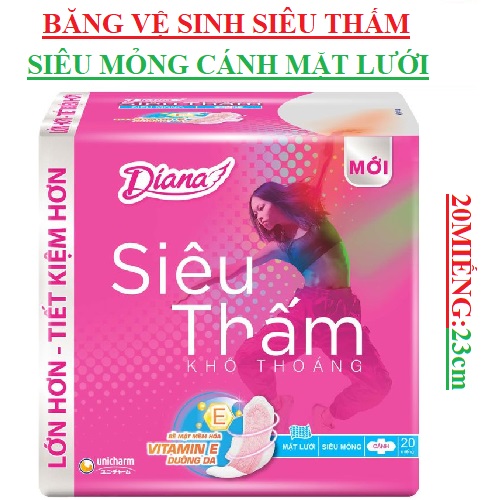 Băng Vệ Sinh Diana Siêu Thấm là dòng băng vệ sinh ban ngày thuộc thương hiệu Diana, có kiểu dáng thời trang độc đáo vừa vặn ôm sát cơ thể ngay cả khi vận động, cùng độ dày phù hợp và khả năng thấm hút vượt trội cho bạn gái luôn tự tin ngay cả trong ngày nhiều. Đặc biệt, sản phẩm ứng dụng công nghệ NANO Bạc giúp kháng khuẩn, ngăn ngừa viêm nhiễm và mùi hôi hiệu quả.