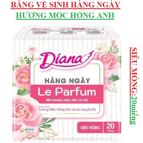 Băng vệ sinh hằng ngày Diana Le Parfum hương mộc hồng anh là sản phẩm băng vệ sinh hàng ngày thích hợp sử dụng cho ngày cuối chu kì hoặc sử dụng hằng ngày. Băng vệ sinh Diana được lấy cảm hứng từ hương gỗ và hương Hoa Hồng Anh Quốc, sản phẩm mang đến hương thơm nồng nàn và nữ tính, dễ chịu.