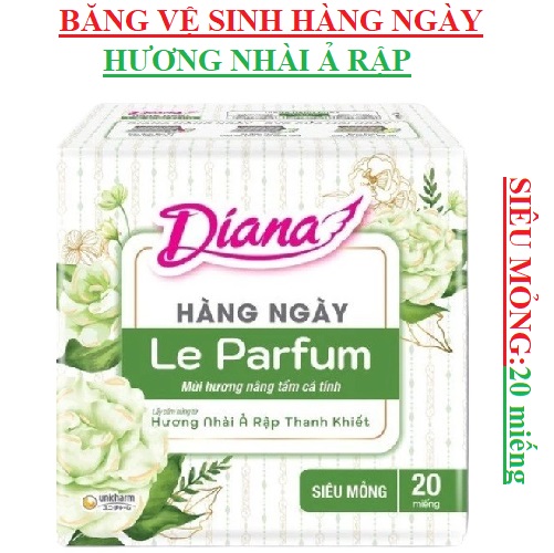 Băng vệ sinh hằng ngày Diana Le Parfum hương hoa nhài là loại băng vệ sinh có hương thơm được lấy cảm hứng từ Hoa Nhài Ả Rập thơm dịu nhẹ. Băng vệ sinh Diana có màng thấm Nature-Soft chứa 3 loại tinh dầu, thiết kế Curve-fit thấm hút, linh động ôm sát theo cơ thể cho bạn thoải mái hoạt động