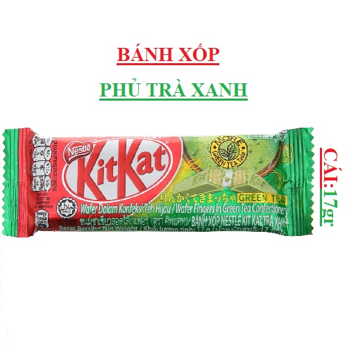 Bánh xốp phù socola hương trà xanh. Bánh xốp giòn, thơm cùng lớp socola trà xanh phủ bên ngoài ngọt thanh hòa quyện vào nhau rất hoàn hảo. Bánh xốp phủ trà xanh KitKat thanh nhỏ gọn, dễ mang theo bên người. Bánh xốp KitKat được sản xuất tại Malaysia chất lượng, an toàn